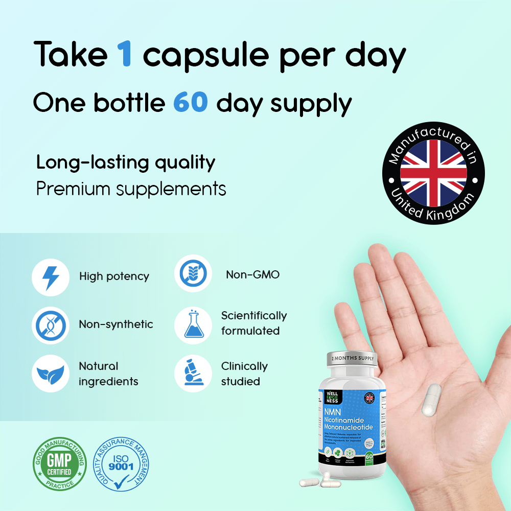 • Each capsule contains 500mg of 99% pure Nicotinamide Mononucleotide (NMN).