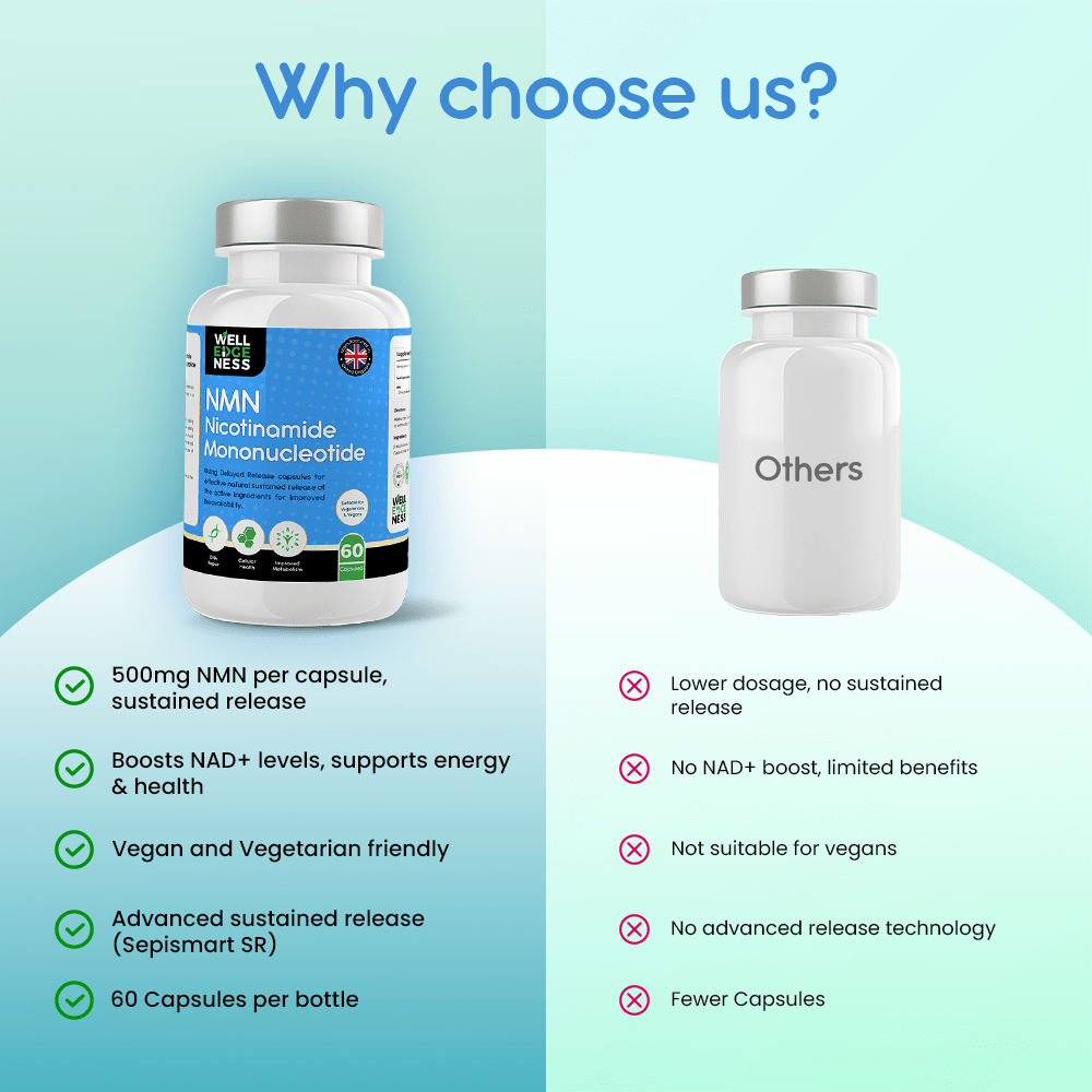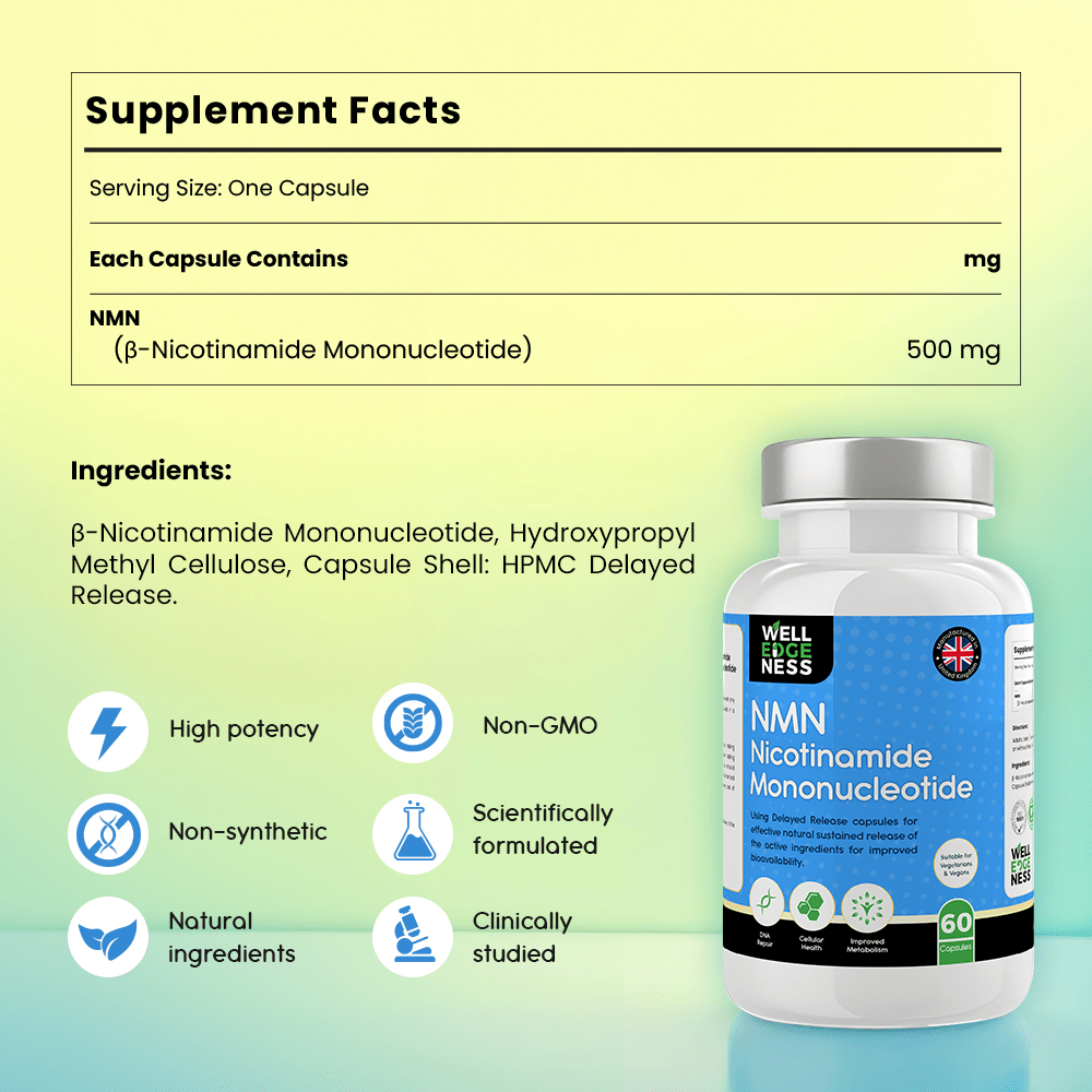 WELLEDGENESS™Nicotinamide Mononucleotide (NMN) is formulated with carefully chosen ingredients and a pure formula to support and maintainNAD levelsin the body. In our body, NAD plays a significant role in the production of energy. As we age, our bodies produce less NAD, which is why we have developed our pure NMN supplement. NAD+ levels are replenished by NMN, maintaining normal energy levels and supporting overall wellbeing. We can incorporate our NMN into our daily routine to assist with supporting skin, joints, immune system by reducing free radicals in our body.